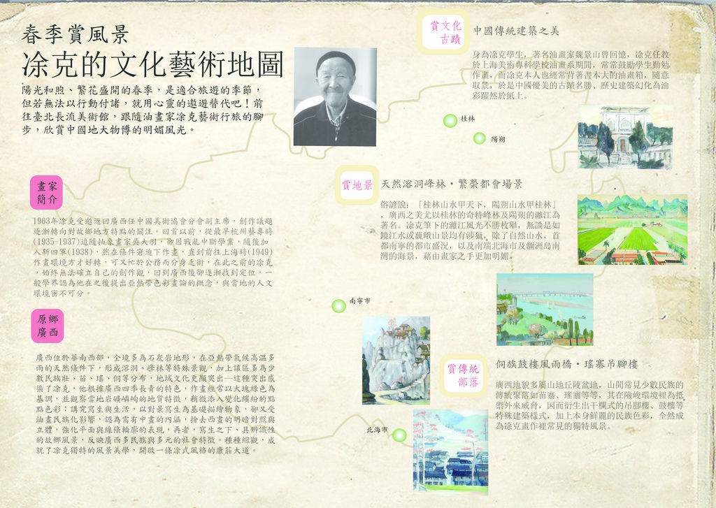 俗諺說:「桂林山水甲天下,陽朔山水甲桂林」,廣西之美尤以桂林的奇特峰林及陽朔的灕江為著名。凃克筆下的灕江風光不勝枚舉,無論是如鏡江水或蘶峨山景均有涉獵,除了自然山水,首都南寧的都市盛況,以及南端北海市及潿洲島南灣的海景,藉由畫家之手更加明媚。