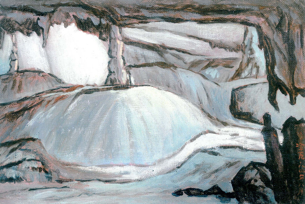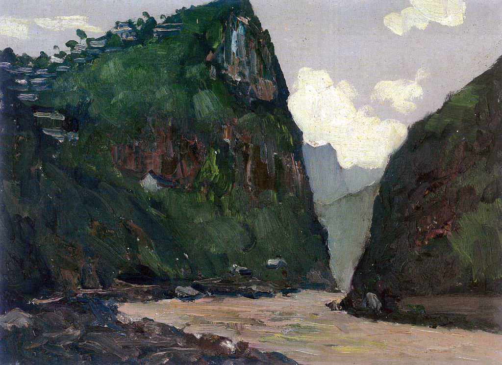 大藤峽位於廣西桂平城區西北處的黔江下游,為境內最長的峽谷。峽谷江水湍急,河道曲折,險峻難行。凃克的〈大藤峽〉猶如站於岸旁瞻望壯麗山川,前景黃土交雜的江水波濤洶湧順勢流過,引導至中景幾近垂直聳立的高大峭壁,再者遠景山影交疊,整體營造出深遠的空間感受。