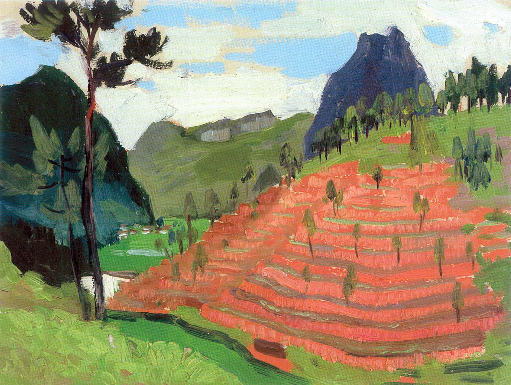 長江以南的丘陵地區,在高溫多雨的氣候環境下發育一種含鐵量多的紅色土壤,這種土壤有機質少、酸性強,植物不易生長,僅能改良土質種植經濟作物。〈紅土地〉中用一致的磚紅色表現這種土壤特質,光禿貧脊的坡地上樹木零散錯落,對比周圍生機蓬勃的山景,恰如其分地傳達出地域特色。