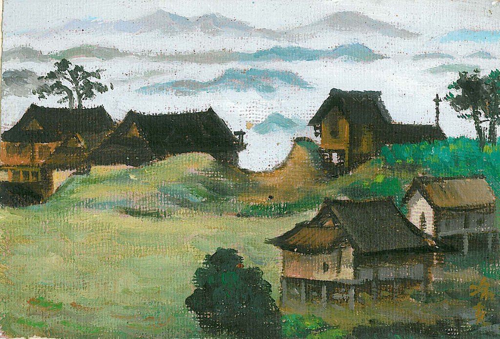 元寶山位於柳州市融水苗族自治區,為廣西第三高峰,因山體南北突出,中央凹陷,與元寶相似而得名。該區有少數民族苗、瑤、侗居住,山裡珍貴植披遍布。〈雨後元寶山〉描繪陰雨過後天際未開之山景,一棟棟「吊腳樓」聚集在起伏的山勢上。吊腳樓常見於偏遠區域,是為了預防蟲獸與潮濕而規畫成三層的特色建築,在畫面中凃克用古樸設色加以簡要的輪廓設計,展現當地獨特的文化風情。