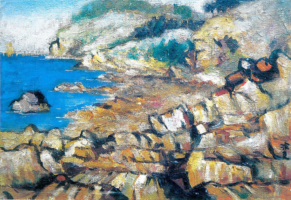 廣西除了青山綠水之外,沿海風光也為人稱道,廣西北海市南端海面上有一「潿洲島」,是境內最大的島嶼,南灣即位於島嶼之南,周圍為火山沉積岩,經過海浪與潮汐的日夜侵蝕,形成陡峭的海蝕地形,壯觀灣石與湛藍海水相互對應,是令人心曠神怡的美景。凃克在〈南灣海邊〉裡用粗曠的黑色線條勾勒輪廓,表現出岩塊質感,在土黃色的岩面上添入了白、紅色彩,加以海面的蔚藍,呈現海邊熱鬧繽紛之感。