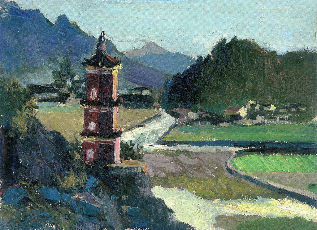 文昌塔分布於中國境內廣西、湖南等各大城市,是傳統宗教建築的一種,具有庇護、祈禱功能。古代先民為使在地子弟功名事業繁盛,往往建造文昌塔加以祈福,而塔的形制又有樓閣式與密檐塔式等。本幅作品〈文昌塔〉形制為三級樓閣式塔,是一座紅色塔身襯以白色塔門的美麗建物,背景為涓涓溪流與鄉間田野,恰是人文建築與自然之美融合的最佳寫照。