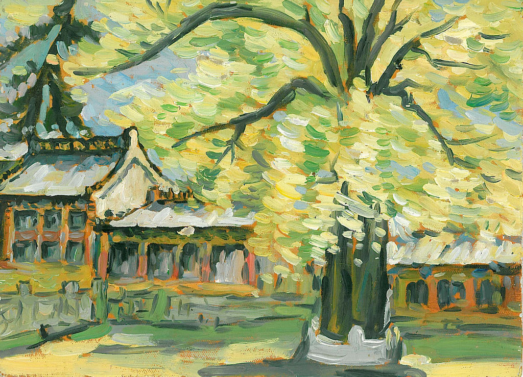 潭柘寺建於西晉(265~316),距今已有1700多年的歷史,為北京城內最早的寺廟。寺名取自鄰近的龍潭與寺內周圍生長的拓樹,合稱為「潭拓」。寺內有樓閣、殿堂、亭院等建物,體現中國傳統建築之美。〈潭柘寺的銀杏樹〉中描繪院裡著名的銀杏樹景,相傳清代乾隆皇帝御賜庭院兩棵銀杏為「帝王樹」和「配王樹」,至今已有千年的樹齡。在此凃克捕捉了季節交替、樹葉由黃轉綠的時刻,利用線條動感、顏色營造和煦溫馨的氛圍。