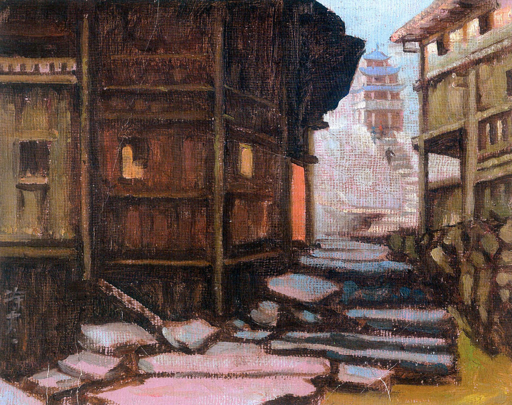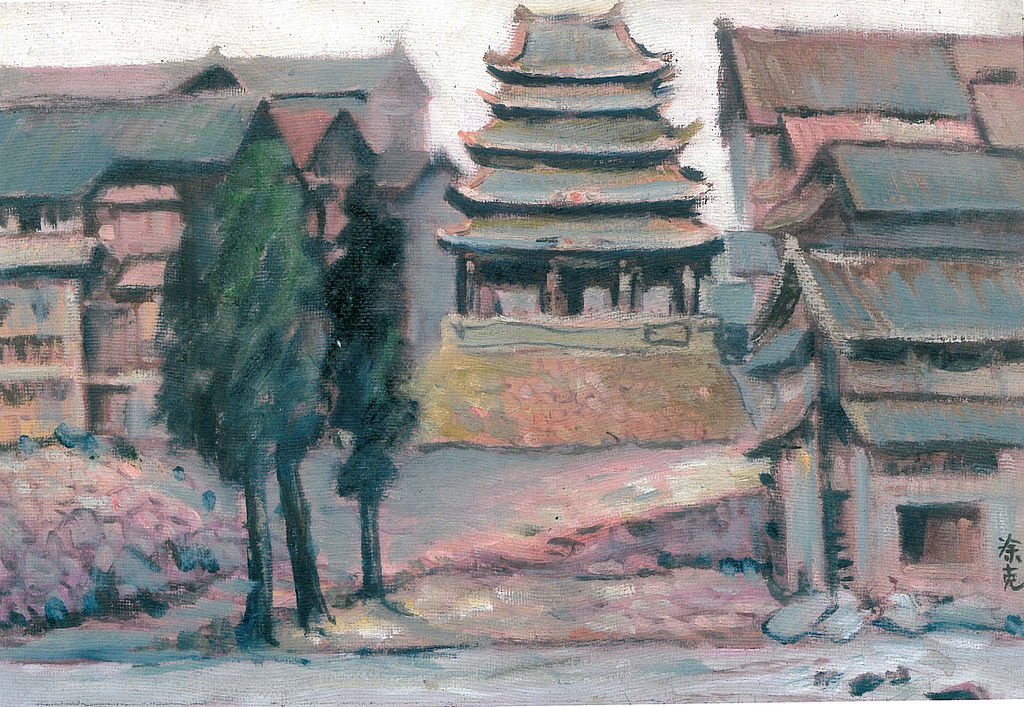 鼓樓為侗寨常見的建築,幾乎在每村都有鼓樓,是村人議事集會的會堂,因樓上置鼓做警戒報時之用而得名。鼓樓平日是社交娛樂的場所,依建築而有干欄式、樓閣式、密簷式等形制。在〈侗族鼓樓〉描繪之鼓樓為五層樓閣式建築,底層正方有四根條柱支撐,左右兩側建物聚集,在鼓樓前方則為大塊的斜坡空地。畫面中,凃克用相似的灰綠色調凝聚古樸氛圍,在輪廓上加入紅色線條,使得景物具有朦朧之美。