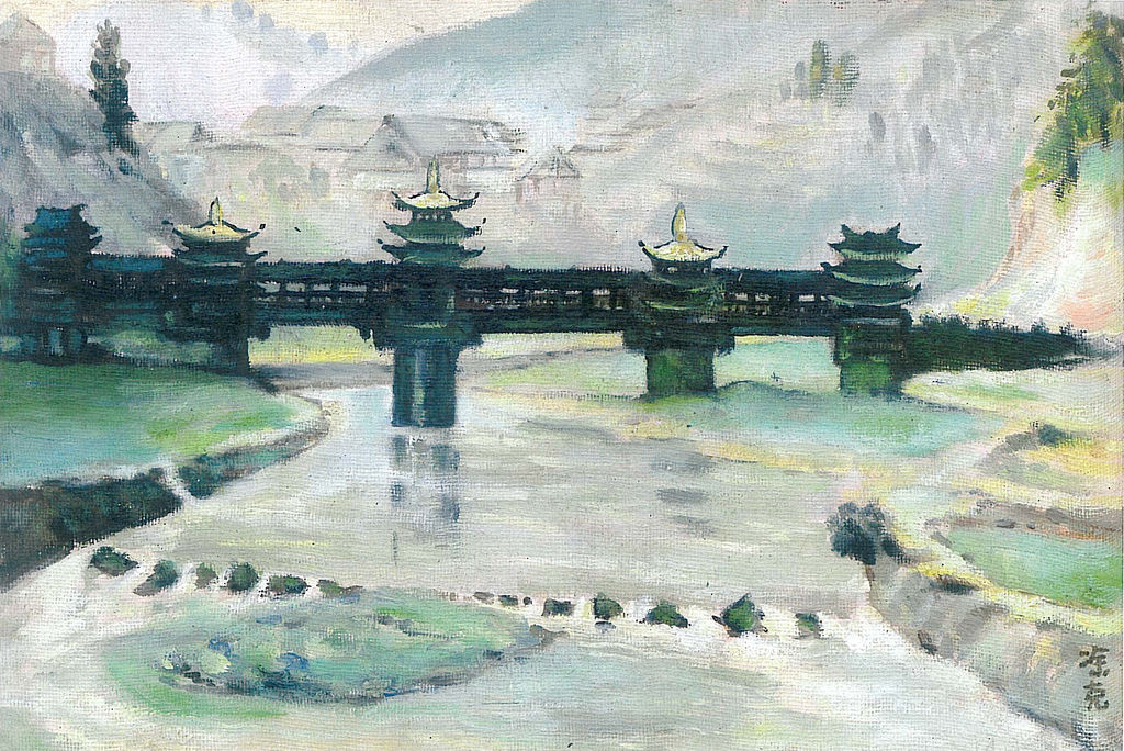 侗族除了鼓樓,風雨橋也是其建築藝術的精華,往往於環繞村寨的河流或小溪建造一座長廊式的建築體,由於功能在讓路人遮風避雨之用,故稱風雨橋或花橋。在〈侗族風雨橋〉中,橋體又再加建多層式鼓樓,為古色古香的鼓樓式花橋,橋下河水涓涓細流,岸邊綠意盎然,遠方山寨白霧迷濛,靜謐且生動。